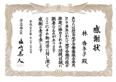この度、当社会長 林 香与子は、長年徳島地方労働審議会の代表委員を務め、労働行政の推進に尽力したことの功績に対し、「厚生労働大臣感謝状」を授与されました。