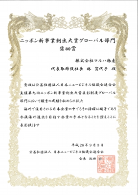 当社はこの度、公益社団法人日本ニュービジネス協議会連合会が主催する、「第9回ニッポン新事業創出大賞 グローバル部門」において、「奨励賞」を受賞致しました。