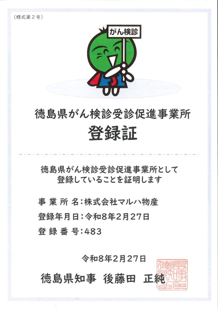 この度、株式会社マルハ物産は「徳島県がん検診受診促進事業所」に登録されました。