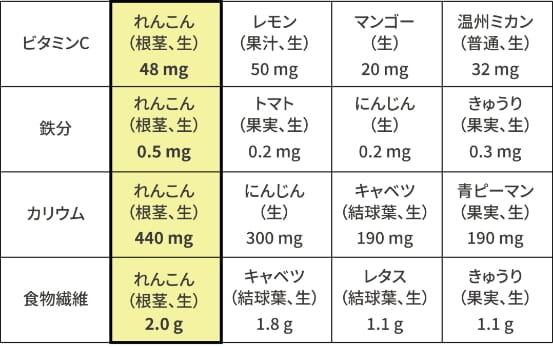 れんこん/根茎/生 可食部100g中(八訂食品成分表より抜粋)
