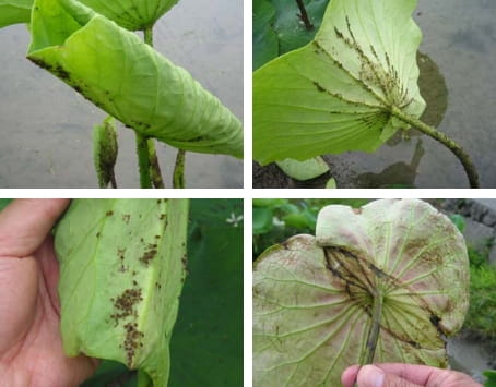 「れんこん」の栽培において浮き葉、立ち葉が成長する5月中旬~6月頃、若いハス(れんこん)の葉にアブラムシが発生します。このアブラムシが柔らかい葉から養分を吸い、葉の成長を止めてしまいます。そうなると「れんこん」に栄養分を貯めることができずに収穫量に大きな被害を与えます。
